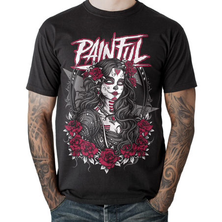 Dive into the dark and captivating world of Painful Clothing with the “Valentina” T-shirt.